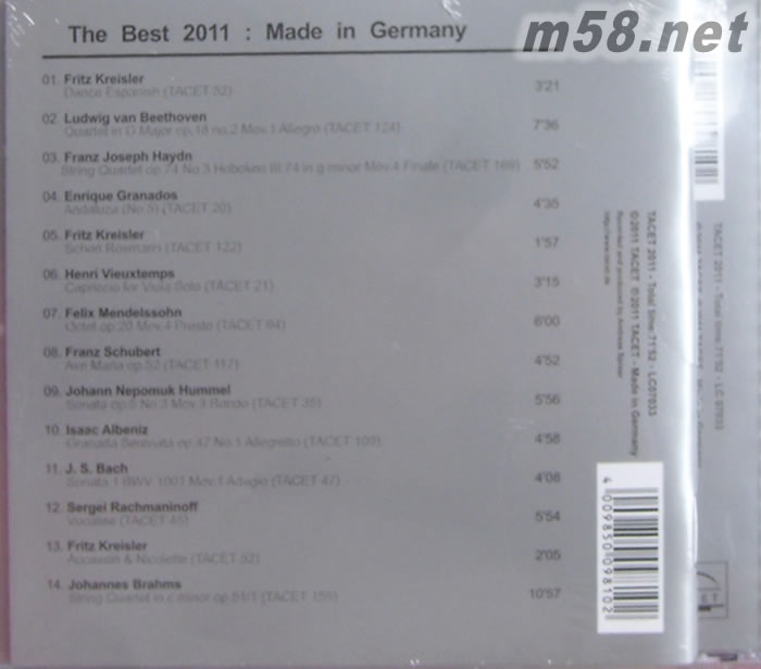 膽咪2011 TACET 精選The Best of TACET 2011 - 扣人心弦 真空管(m58.net) 德國(guó)古典發(fā)燒大廠TACET 2011年度鉅獻(xiàn) 完全收錄旗下最經(jīng)典的弦樂(lè)錄音 撩撥您追求完美的聽(tīng)覺(jué)神經(jīng) 體驗(yàn)最華麗的心靈饗宴 樂(lè)迷萬(wàn)眾期待,德國(guó)TACET終於推出一年一度的精選發(fā)燒天碟,本精選<扣人心弦?真空管>完整收錄TACET旗下所有弦樂(lè)錄音中的上上之作。 從04年開(kāi)始推出年度精選的發(fā)燒大廠TACET,歷年來(lái)推出過(guò)包括包括得獎(jiǎng)作品集、鋼琴精選等主題,這次2011年終壓軸推出旗下最杰出的弦樂(lè)錄音精選<扣人心弦?真空管>,囊括貝多芬、拉赫曼尼諾夫、孟德?tīng)栱灐⑹娌亍凸⒑nD、布拉姆斯等大師作品,曲目類型包括如吉他二重奏、鋼琴小提琴二重奏、中提琴鋼琴二重奏、小提琴獨(dú)奏、弦樂(lè)四重奏等。 專輯中使用史特拉第瓦里、瓜納里、盧杰利等多把名琴,演奏者名單也是一時(shí)之選,有小提琴家Daniel Gaede、奧云弦樂(lè)四重奏、中提琴演奏名家Hartmut Lindemann、羅馬尼亞國(guó)家音樂(lè)大賽首獎(jiǎng)得主Florin Paul等在歐陸頗具名氣的演奏家。 再加上TACET以Neumann真空管麥克風(fēng)與頂級(jí)設(shè)備錄音,無(wú)論是小提琴獨(dú)奏中令人盪氣迴腸的聲線,還是四重奏中那飽滿溫潤(rùn)的音場(chǎng),演奏弦樂(lè)器時(shí)琴弓與琴弦摩擦的存在感,全都鉅細(xì)靡遺的忠實(shí)記綠;若您每次面對(duì)唱片行架上那些讓人眼花撩亂的弦樂(lè)器專輯卻無(wú)從下手,那么這張不論是從錄音、選曲或是演奏家三方面來(lái)看,都是無(wú)懈可擊的<2011 TACET 精選---扣人心弦?真空管>,將會(huì)是您最好的選擇!