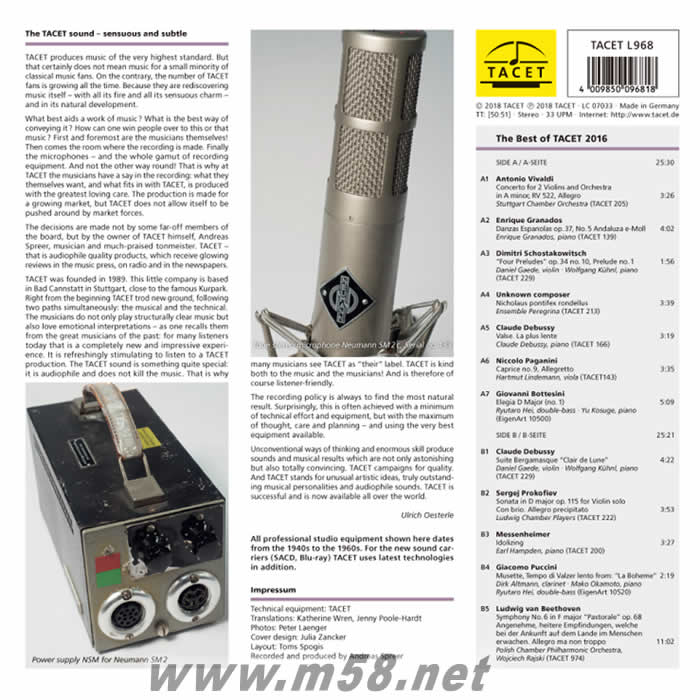 膽咪精選2016 TACET 2016 180g 33RPM LP 發燒美樂 真空管 黑膠(m58.net) 發燒錄音 極致美樂 完美呈現 德國古典發燒大廠用心三年的匠心年度鉅獻 發燒友引頸期盼,苦等三年,德國TACET終於推出年度精選「TACET 2016精選 – 發燒美樂.真空管」,音樂類型涵蓋交響樂、鋼琴、小提琴,弦樂重奏、單簧管、以及人聲,從頭至尾絕無冷場、相當精彩。曲目包括:韋瓦第/a小調雙小提琴協奏曲、葛拉納多斯/西班牙舞曲、貝多芬/第六號交響曲 - 田園、帕格尼尼/隨想曲…等大師的偉大作品,尤其幾首是用Tacet的「迷孃系統紙捲鋼琴」,讓我們聆聽到作曲家本人所演繹的珍貴紀錄。TACET2016精選的音樂性、音響性、聆聽效果、測試等級皆達滿分,如此極致的美樂,懂音樂的您豈能錯失!