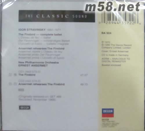 史特拉玟斯基 火鳥(niǎo)Stravinsky: The Firebird(m58.net) 芭蕾舞劇《火鳥(niǎo)》斯特拉文斯基完成于1910年4月。6月25日,在巴黎歌劇院首演,獲得了空前的成功。演出結(jié)束后,前來(lái)觀看演出的德彪西會(huì)見(jiàn)了這位年輕的作曲家,并表達(dá)了自己對(duì)《火鳥(niǎo)》的贊賞。從此,斯特拉文斯基一舉成名。有人還認(rèn)為斯特拉文斯基自從寫(xiě)了《火鳥(niǎo)》組曲后,他就與里姆斯基-柯薩科夫和拉威爾等人并駕齊驅(qū)了。芭蕾舞劇《火鳥(niǎo)》的劇本是由俄羅斯舞劇團(tuán)的編導(dǎo)米哈伊爾•福金根據(jù)一個(gè)古老的俄羅斯傳說(shuō)而編寫(xiě)的。劇情大致為:王子伊凡為解救被魔王卡茨囚禁在城堡中的公主,與魔王進(jìn)行了一番搏斗,但不幸被魔王捉住。關(guān)鍵時(shí)刻,王子得到了一只神奇火鳥(niǎo)的幫助,最終戰(zhàn)勝了魔王,救出了公主。斯特拉文斯基后來(lái)根據(jù)芭蕾舞劇《火鳥(niǎo)》的總譜改編了三部組曲,其中以第二部組曲最為著名,是當(dāng)今音樂(lè)會(huì)上經(jīng)常演奏的版本。這部組曲共分七段:一、引子。樂(lè)曲以帶弱音器的低音弦樂(lè)器奏出一段起伏的陰暗旋律為開(kāi)始。二、火鳥(niǎo)之舞。三、火鳥(niǎo)變奏曲。四、公主之舞。五、火鳥(niǎo)。魔王的地獄之舞。六、催眠曲。七、終曲。一支獨(dú)奏法國(guó)號(hào)模仿著“公主之舞”中長(zhǎng)笛引子的旋律,奏起了宣告勝利的歡歌。 Decca這套錄音的主角埃內(nèi)斯特•安塞美(Ernest Ansermet)是享譽(yù)國(guó)際的20世紀(jì)偉大指揮家。 1883年11月11日,安塞美生于瑞士日內(nèi)瓦湖畔小鎮(zhèn)沃韋(Vevey)。29歲那年,在一次偶然的機(jī)會(huì)中,本是數(shù)學(xué)老師的他在蒙特勒(Montreux)臨時(shí)代替指揮演出了貝多芬《第五交響曲》,這是他首次登臺(tái)指揮,從此開(kāi)始了他漫長(zhǎng)而輝煌的指揮生涯。 安塞美一生中最大的功績(jī)是1918年在日內(nèi)瓦創(chuàng)建了瑞士羅曼德樂(lè)團(tuán),其目的是栽培本國(guó)樂(lè)手人才。安塞美擔(dān)任羅曼德樂(lè)團(tuán)指揮長(zhǎng)達(dá)49年直至去世,成為與一個(gè)樂(lè)團(tuán)長(zhǎng)期合作最久的指揮家,這是個(gè)驕人的記錄。1924年后的3年,安塞美曾兼任阿根廷布宜諾斯艾利斯交響樂(lè)團(tuán)的指揮,1928年曾與科爾托(A.Cortot)同任巴黎交響樂(lè)團(tuán)的指揮。二戰(zhàn)前后,他還經(jīng)常在世界各國(guó)著名樂(lè)團(tuán)擔(dān)任客席指揮。1947年他在格林德柏恩歌劇院指揮布里頓《盧克萊修受辱記》的首演,1949年他帶領(lǐng)羅曼德樂(lè)團(tuán)赴美國(guó)巡回演出。 安塞美對(duì)無(wú)調(diào)性音樂(lè)很反感,很質(zhì)疑其價(jià)值。此外安塞美認(rèn)為,指揮應(yīng)該背譜指揮,不過(guò)他自己卻總是帶譜上臺(tái),因?yàn)樗J(rèn)為,這樣才不至于忽略細(xì)節(jié)。他指揮的時(shí)候,手勢(shì)間接明晰,卻很能向樂(lè)團(tuán)傳達(dá)自己的思想。他反對(duì)指揮家以自己的個(gè)性強(qiáng)加于作品之中,主張要以作曲家的風(fēng)格來(lái)表現(xiàn)作品,這正是安塞美指揮的一大長(zhǎng)處。安塞美以演繹斯特拉文斯基的音樂(lè)和其他俄國(guó)作曲家,如柴可夫斯基、普羅柯菲耶夫和穆索爾斯基的作品享譽(yù)國(guó)際。特別在芭蕾舞曲方面,安塞美可謂獨(dú)霸一方。他指揮的《天鵝湖》、《春之祭》、《羅密歐與朱麗葉》都完美展現(xiàn)了舞臺(tái)表演的興奮感和舞蹈的推動(dòng)感,這恐怕是許多指揮家所不及的,一直被奉為最佳演繹。 1969年2月20日,安塞爾美逝世于日內(nèi)瓦,享年86歲。這款《斯特拉文斯基:火鳥(niǎo)》是他指揮英國(guó)新愛(ài)樂(lè)樂(lè)團(tuán)演出灌錄的錄音,為雙碟套裝,第2張唱片收錄的內(nèi)容是他在指揮現(xiàn)場(chǎng)的實(shí)況錄音。