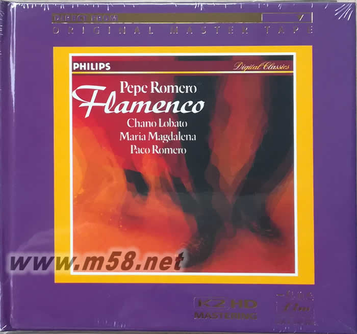 FLAMENCO 法蘭明高吉它K2HD(紫色封面)(m58.net) 吉它:PEPE ROMERO PEPE佩佩生于西班牙馬拉加的“吉他皇族”羅梅羅家,父親與三個兒子全是世界著名的吉它演奏家。PEPE和他的兄弟們能夠取得這樣的成就完全都受父親謫傳。他那具有傳奇色彩的父親塞萊多尼奧·羅梅羅是他唯一的吉他老師。當佩佩還只有七歲時,他就在一場與父親的聯袂音樂會中進行了首次職業性演出。 動人心魄的詮釋和天衣無縫的技巧,使吉他演奏家佩佩·羅梅羅聞名遐邇,也經常使他的吉他獨奏會及與管弦樂隊的合作炙手可熱。 佩佩的演奏水平高超,音量豐滿,具有朝氣,充滿男子氣概,具有非常濃厚的西班牙風味。另外與圣馬丁室內樂團合作錄制的朱利亞尼吉他協奏曲全集、勃克里尼吉他吉他五重奏專集以及阿蘭胡埃斯吉他吉他協奏曲均是吉他音樂寶庫中的精品