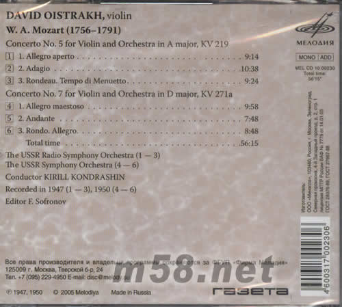 W.A.MOZART(1756-1791) CONCERTO NO.5 FOR VIOLIN AND ORCHESTRA IN A MAJOR ,KV 219 1.ALLEGRO APERTO 2.ADAGIO 3.RONDEAU.TEMPO DI MENUETTO CONCERTO NO.7 FORVIOLIN AND ORCHESTRA IN D MAJOR ,KV 27LA 4.ALLEGRO MAESTOSO 5.ANDANTE 6.RONDO .ALLEGRO TOTAL TIME THE USSR RADIO SYMPHONY ORCHESTRA(1-3) THE USSR SYMPHONY ORCHESTRA(4-6) CONDUCETOR KIRILL KONDRASHIN RECORDED IN 1947(1-3),1950(4-6)