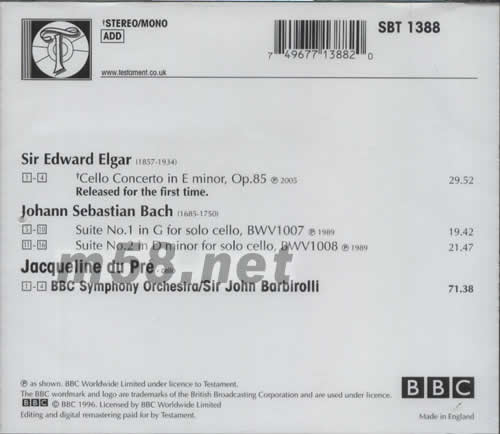 SIR EDWARD ELGAR(1857-1934) 1-4.CELLO CONCERTO IN E MINOR,OP.85 RELEASED FOR THE FIRST TIME JOHANN SEBASTIAN BACH(1685-1750) 5-10.SUITE NO.1 IN G FOR SOLO CELLO,BWV1007 11-16.SUITE NO.2 IN D MINOR FOR SOLO CELLO,BWV 1008 JACQUELINE DU PRE-CELLO 1-4.BBC SYMPHONY ORCHESTRA/SIR JOHN BARBIROLLI