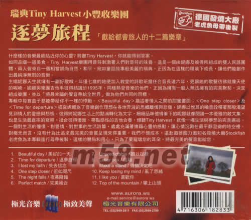 逐夢旅程 瑞典小豐收樂團(tuán)(m58.net) 逐夢旅程 小豐收樂團(tuán)[漫步在清晨的鄉(xiāng)間小道暖暖的陽光灑落來自樹林的風(fēng)迎面徐徐吹來。身旁有你,旅程不再孤寂] 遠(yuǎn)赴德國,力邀國際知名發(fā)燒大廠老慮魚母帶后制 什么樣的音樂最能貼近你的心靈?聆聽TINY HARVEST,你就能得到答案。 如同品嘗一首美食,TINY HARVEST樂團(tuán)用音符刺激著人們對音符的味覺。這是一個(gè)由妮娜及彼得所組成的雙人民謠團(tuán)體,兩個(gè)皆來自一個(gè)相當(dāng)崇尚自然、和平、宛如童話故事般美麗的瑞典,正因?yàn)樵谶@樣的環(huán)境下成長,讓他們能創(chuàng)作出最純凈無瑕的音樂。 主唱妮娜天生就擁有一副好歌喉,年僅七歲的她便加入教堂的詩歌班但任合音長達(dá)六年,更讓她的歌聲彷佛就像天使的呢喃。妮娜與樂團(tuán)吉他手彼得結(jié)識于1995年,同樣熱愛音樂的他們,正因?yàn)閾碛幸话闳藷o法擁有的完美時(shí)默契,決定組成樂團(tuán),并以[將最幸福的聲音帶給全世界]做為他們共同的目標(biāo)。 專輯中每首曲子都能帶給你不一樣的悸動。(BEAUTIFUL DAY)描述著情人之間的甜蜜畫面;(ONE STEP CLOSER)及(TIME FOR DEPARTURE)描寫妮娜為了音樂創(chuàng)作理想在各地奔波的思鄉(xiāng)離情與悲傷,妮娜以悅耳的嗓音詮釋著那股渴望見到情人的愛戀與愁悵。彼得將妮娜生活上的點(diǎn)滴轉(zhuǎn)化為文字,細(xì)細(xì)品味彼得筆下的妮娜就像閱讀一本優(yōu)雅的散文集也是生活最直率的這與照。揉合彼得優(yōu)雅、帶點(diǎn)感性的吉他合奏,傾聽TINY HARVEST,就像一場生活與夢想的完美邂逅。一個(gè)對生活的憧憬、對愛情、對世事的生活詩篇,處處充滿著撫藉心靈的感動,讓必情沉淀在最平靜澄徹的時(shí)空里。對極光而言,沒有什么為比追求最完美的音質(zhì)呈現(xiàn)來得重要。我們不惜成本,遠(yuǎn)赴邀德國力邀知名發(fā)燒大廠STOCKFISH老虎魚為本專輯進(jìn)行母帶后制這樣的體貼和用心,只為了要寵壞您的耳朵,將最完美的聲音獻(xiàn)給您。