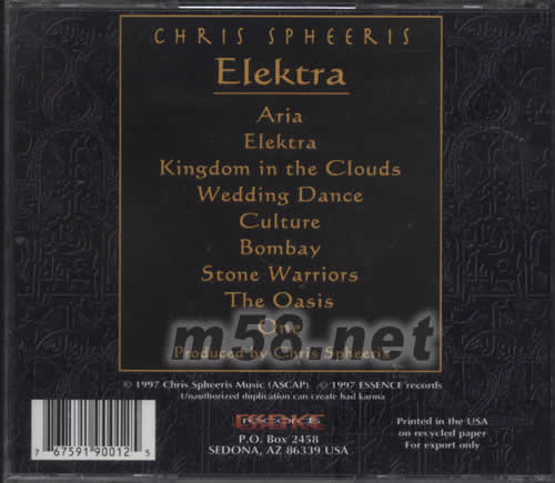 1.ARIA 2.ELEKTRA 3.KINGDOM IN THE CLOUDS 4.WEDDING DANCE 5.CULTURE 6.BOMBAY 7.STONE WARRIORS 8.THE OASIS 9.ONE 10.PRODUCED BY CHRIS SPHEERIS