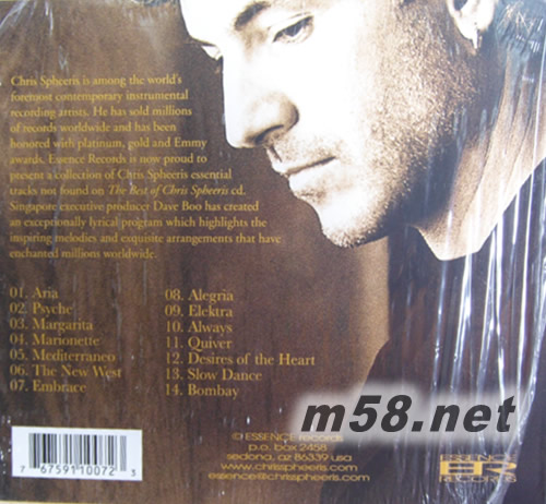 精華所在 Essentials(m58.net) 優(yōu)雅帥氣的希臘音樂家 Chris Spheeris 克利斯·斯菲里斯 在2005年發(fā)行了這張精選性質(zhì)的專輯《Essentials 精華所在》。專輯從他過往的4張成功作品《Culture 文明》、《Desires 欲望》、《Eros 愛神》和《Dancing With The Muse 與繆斯共舞》里選取了總共14軌音樂集合而成。通過這張《Essentials 精華所在》,你可以很快的了解 Chris Spheeris 成功的創(chuàng)作理念和風(fēng)格;誠(chéng)然,也是對(duì)他過去幾年的一次完美回顧。