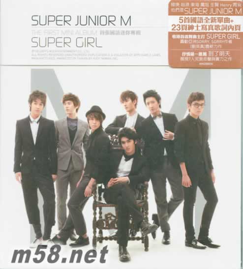首張國語迷你專輯 SUPER GIRL 臺灣版(m58.net) 韓庚 始源 東海 萬旭 圭賢 Hnery 周覓 他們是SUPER JUNIOR M 5首國語全新單曲+ 23頁紳士寫真歌詞內(nèi)頁 收錄首波主舞曲主打SUPER GIRL 轟動亞洲SORRY。SORRY作者 [劉英真]最新力作 抒情第一推芥 到了明天 展現(xiàn)7人完美合聲與實力派