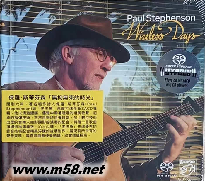 無拘無束的時光 Wireless Days SACD(m58.net) Paul Stephenson (主唱及結他) Jens Kommnick (結他) Ian Melrose (結他) Lea Morris (和唱) Justin Ciuche (中提琴) Manfred Leuchter (手風琴及“哈蒙德”; 電風琴b3) Beo Brockhausen (薩克斯管、 敲擊、手風琴、合成器鍵盤及和弦齊特琴) Lars Hansen (電低音結他) 1. 著名唱作詩人保羅‧斯蒂芬森(Paul Stephenson)曾與錄音界巨擘“老虎魚(Stockfisch)”數度合作,他那獨特的風格與如泉水般清澈、優雅中帶著暖意的絕美聲線,創作的歌詞清新脫俗,配合他超凡的結他技術,自彈自唱時彷如置身于一片綠悠悠的大草原般憩靜放鬆,贏得歌迷好評如潮,被視為“發燒男聲”翹材份子之一。