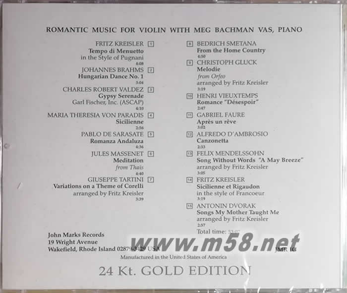 ROMANTIC MUSIC FOR VIOLIN WITH MEG BACHMAN VAS,PIANO 01. FRITZ KREISLER Tempo di Menuetto in the Style of Pugnani 02. JOHANNES BRAHMS Hungarian Dance No.1 03. CHARLES ROBERT VALDEZ Gypsy Serenade Garl Fischer,Inc.(ASCAP) 04. MARIA THERESIA VON PARADIS Sicilienne 05. PABLO DE SARASATE Romanza Andaluza 06. JULES MASSENET Meditation from Thais 07. GIUSEPPE TARTINI Variations on a Theme of Corelli arranged by Fritz Kreisler 08. BEDRICH SMETANA From the Home Country 09. CHRISTOPH GLUCK Melodie from Orfeo arranged by Fritz Kreisler 10. HENRI VIEUXTEMPS Romance "Desespoir" 11. GABRIEL FAURE Apres un reve 12. ALFREDO D'AMBROSIO Canzonetta 13. FELIX MENDELSSOHN Song Without Words "A May Breeze" arranged by Fritz Kreisler 14. FRITZ KREISLER Sicilienne et Rigaudon in the style of Francoeur 15. ANTONIN DVORAK Songs My Mother Taught Me arranged by Fritz Kreisler
