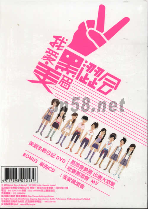 我愛黑澀會(m58.net) 正在唱的歌 七八年級美眉 成雙箭齊發 美眉星勢力 [V]制造 ALL IN ONE美眉私密日記DVD+全彩寫真書 +我愛黑澀會SINGLE CD 獨家珍藏美眉第一次新鮮曝光