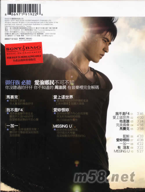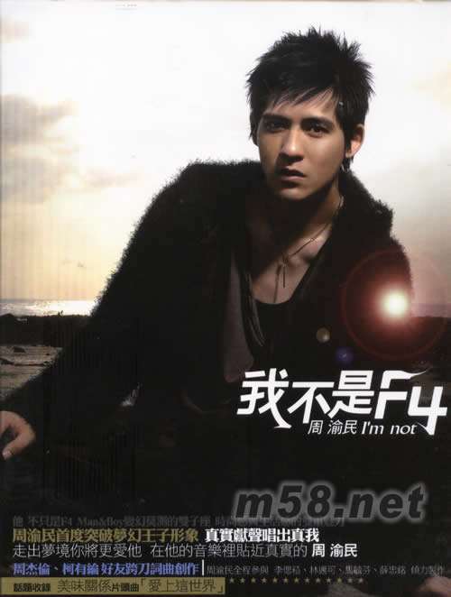 我不是F4(m58.net) 繼早前F4正式改名為FVKV後,成員之一仔仔周渝民一直忙于偶像劇《美味關(guān)系》的拍攝及宣傳工作,2007年他終于推出第三張個(gè)人唱片《我不是F4》,并首度拋開(kāi)偶像情人的身段來(lái)唱出真我,讓歌迷認(rèn)識(shí)更真實(shí)的仔仔! 繼上一張《記得我愛(ài)你》而三年多沒(méi)發(fā)片的仔仔,在新碟中走非偶像情歌路線,并嘗試主打走溫暖曲風(fēng)。主打歌「我不是F4」乃周杰倫為仔仔量身打造,與林邁可打造歌詞,單看歌名便可想而知新曲中充滿周董式黑色幽默。