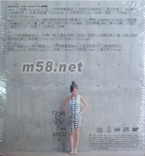 CD 01. 近 02. 世界請看著我 03. 一千零一個 04. 愛自然愛 05. 送我一個家 06. 純情有罪 07. 趕 08. 無心戀唱 09. 通宵店的鏡 10. 黑眼圈 11. (They Long To Be)Close To You(English) DVD 01. 送我一個家 MV 02. 無心戀唱 MV 03. 世界請看著我 MV 04. 愛自然愛 MV 05. 純情有罪 MV 06. 感應 MV 07. 你我她(Karaoke) 08. 一時倦了(Karaoke) 09. 花無雪(Karaoke) 10. 黛玉笑了(Karaoke) BONUS CD Vincy.Close to You音樂會 DISC A 01. 感應(Opening) 02. 近 03. 世界請看著我 04. 我是你的樂與怒 05. 愛自然愛 06. 無心戀唱 07. 純情有罪 08. 我真的受傷了(泳兒/吳浩康) 09. 天使明明在此 10. 送我一個家 11. 你我她 12. 死性不改(泳兒/洪卓立) DISC B 01. Dance Medley(傾斜樂團/通宵店的鏡/瘋了) 02. 小學館(泳兒/鐘舒漫/洪卓立/吳浩康) 03. 電燈膽 04. 我懷念的 05. 笑忘書 06. 愿 07. 愛在記憶中找你(泳兒/林峰) 08. 赤地轉機(林峰) 09. 請不出聲 10. 中國話 11. 黛玉笑了 12. 一時倦了 13. 花無雪 14. 感應