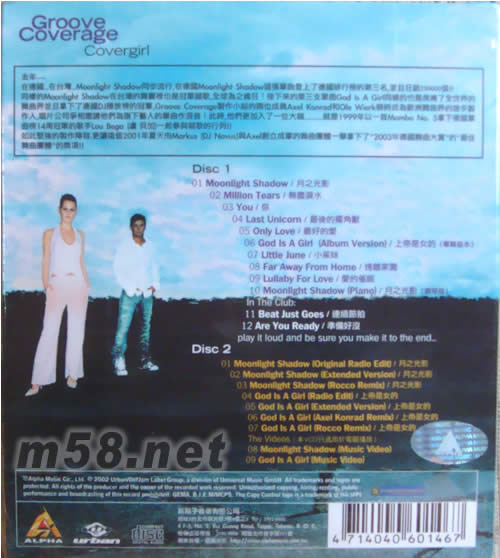 Disc 1 01. Moonlight Shadow /月之光影 02. Million Tears /無盡淚水 03. You /你 04. Last Unicorn /最后的獨(dú)角默 05. Only Love /最好的愛 06. God Is A Girl(Album Version) /上帝是女的(專輯版本) 07. Little June /小茱妹 08. Far Away From Home /遠(yuǎn)離家園 09. Lullaby For Love /愛的催眠 10. Moonlight Shadow(Piano) /月之光影(鋼琴版) In The Club: 11. Beat Just Goes /連續(xù)節(jié)拍 12. Are You Ready /準(zhǔn)備好沒 Play it loud and be sure you make it to the end... Disc 2 01. Moonlight Shadow(Original Radio Edit) /月之光影 02. Moonlight Shadow(Extended Version) /月之光影 03. Moonlight Shadow(Rocco Remix) /月之光影 04. God Is A Girl(Radio Edit) /上帝是女的 05. God Is A Girl(Extended Version) /上帝是女的 06. God Is A Girl(Axel Konrad Remix) /上帝是女的 07. God Is A Girl(Rocco Remix) /上帝是女的 The Videos(本VCD只適用于電腦播放) 08. Moonlight Shadow(Music Video) 09. God Is A Girl(Music Video)