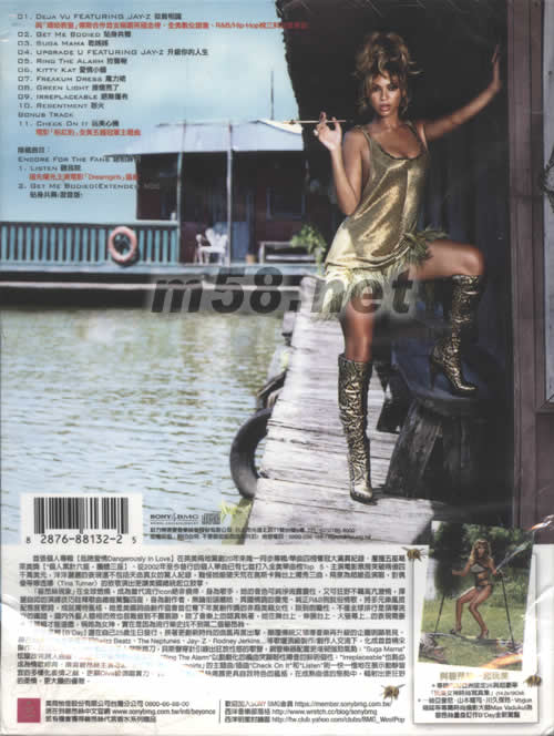 1、DEJA VU 似曾相識 2、GET ME BODIED 貼身共舞 3、SUGA MAMA 干妹妹 4、UPERADE U 升級你的人生 5、RING THE ALARM 拉警報 6、KITIY KAT 愛情小貓 7、FREAKUM DREASS 魔力裙 8、GREEN LIGHT 綠燈亮了 9、IRREPLADEABLE 絕無僅有 10、REBENTMENT 怒火 BONUS TRACK 11、CHECK ON IT 玩美心機 電影《粉紅豹》全美五周冠軍主題曲 隱藏曲目 ENCORE FOR THE FANS 給粉絲們 1、LISTEN 聽我說 搶先曝光主演電影《DREAMGIRLS》插曲 2、GET ME GODIED(EXTENDED)MIX 貼身共舞(混音版)