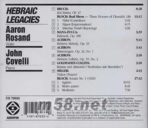 1.BRUCH KOL NIDREI,OP.47 BLOCH:BAAL SHEM--THREE PICTURES OF CHASSIDIC LIFE 2.VIDUI(CONTRITION) 3.NIGUN(IMPROVISATION) 4.SIMCBAS TORAB(REJOICING) 5.MANA--ZUCCA: HAKINOH,OP.186 6.ACHRON: HEBREW MELODY,OP.33 7.ACHRON: STIMMUNGEN,OP.32,NO.1 8.ACHRON: HEBREW LULLABY,OP.35,NO.1 9.GOLDFADEN-COLLINS: RAISINS AND ALMONDS(ROZHINKES MIT MANDELEN) 10.MILLER: YISKOR(PRAYER) BLOCH:SONATA NO.1(1920) 11.AGITATO 12.MOLTO QUIETO 13.MODERATO