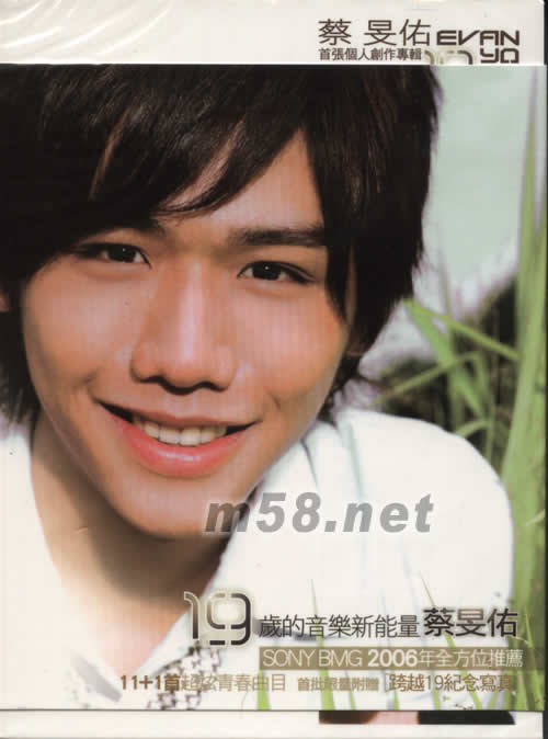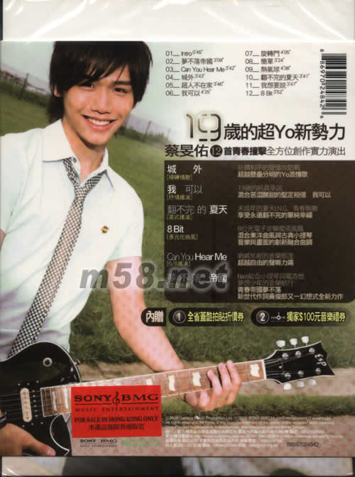 首張個人創作專輯19(m58.net) 19歲的音樂新能量蔡旻佑 SONY BMG 2006年全方位推薦 11+1首超炫青春曲目 首批限量附贈[跨越19紀念寫真] 首批限量附贈跨越19紀念寫真 19歲的超YO新勢力 蔡旻佑12首青春撞擊全方位創作實力演出 城外[磅礴情歌] 祈禱和平的愛情攻防戰超越壁壘分明的YO派情歌 我可以[抒情搖滾] 19歲的純真承諾 混合苦澀酸甜的堅定相信 我可以 翻不完的夏天[英式搖滾] 未完成年的夏天I.N.G.青春無敵 享受永遠翻不完的單純幸福 8BIT[多元化曲風] 8位元電子音樂獨領風騷 混合東洋曲風與古典小提琴 音樂與畫面的創新融合曲調 CAN YOU HEAR ME[6/8搖滾] 吶喊年輕的音樂態度 超越自由的聲嘶力竭 夢不落 帝國[混合曲勢] BASS 結合小提琴與電吉他夢想少年的音樂航行 青春帝國夢不落新世代作詞黃俊郎又一幻想式全新力作 內贈: 1.全省蓋酷拍貼折價券 2.獨家$100元音樂禮券