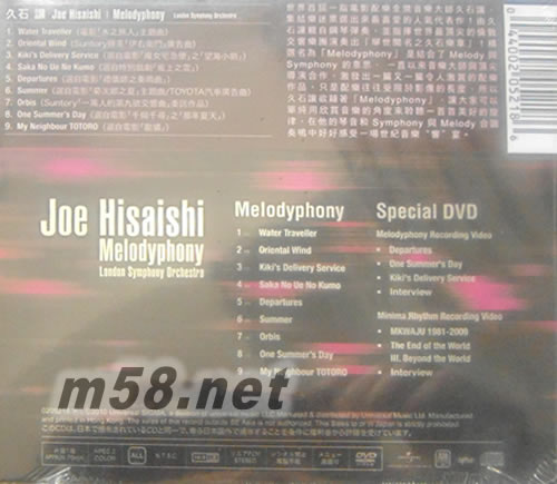 01 Water Traveller(電影「水之旅人」主題曲) 02 Oriental Wind(Suntory綠茶「伊右衛門」廣告曲) 03 Kiki’s Delivery Service(選自電影「魔女宅急便」之「望海小鎮」) 04 Saka No Ue No Kumo(選自特別戲劇「上之云」) 05 Departures(選自電影「送行者」) 06 Summer(選自電影「菊次郎的夏天」主題曲/TOYOTA汽車廣告曲) 07 Orbis(Suntory「一萬人的第九號交響曲」委託作品) 08 One Summer’s Day(選自電影「神隱少女」之「那年夏天」) 09 My Neighbour TOTORO(選自電影「龍貓」)