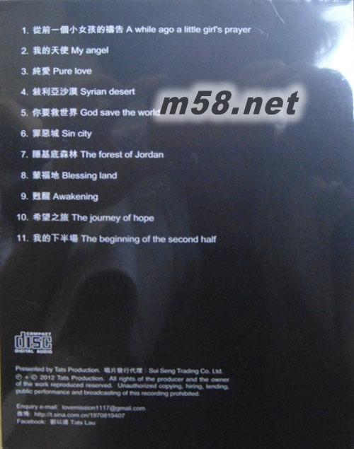 01. 從前一個(gè)小女孩的禱告 A while ago a little girl's pray (performed by 糖兄妹) 國(guó)語(yǔ) 02. 我的天使 My Angel (perfomed by 劉以達(dá)) 粵語(yǔ) 03. 純愛(ài) Pure Love (music) 04. 敍利亞沙漠 Syrian Desert (music) 05. 你要救世界 God save the World (music) 06. 罪惡城 Sin City (music) 07. 隠基底森林 The Forest of Jordan (music) 08. 蒙福地 Blessing Land (music) 09. 蘇醒 Awakening (music) 10. 希望之旅 The Journey of Hope (perfomed by 劉以達(dá)) 粵語(yǔ) 11. 我的下半場(chǎng) The beginning of the Second half (perfomed by 劉以達(dá)) 粵語(yǔ)