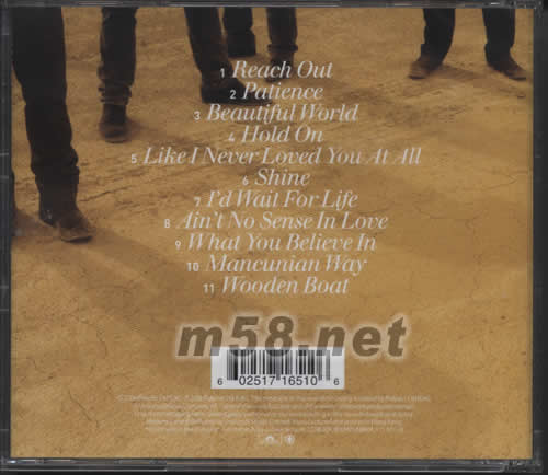1-1 Reach Out 伸出手 1-2 Patience 耐心等候 1-3 Beautiful World 美麗境界 1-4 Hold On 讓愛繼續 1-5 Like I Never Loved You At All 從來沒有愛過 1-6 Shine 星光閃閃 1-7 I'd Wait For Life 一生守候 1-8 Ain't No Sense In Love 愛情零規則 1-9 What You Believe In 唯一信仰 1-10 Mancunian Way 曼徹斯特大道 1-11 Wooden Boat 小木船