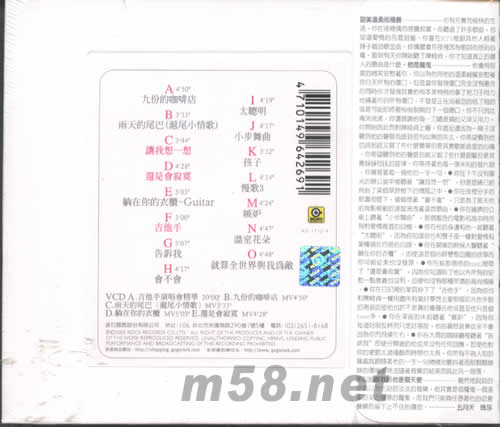 VCD A、吉他手演唱會精華 B、九分的咖啡店 MV C、雨天的尾巴(淚尾小情歌) D、躺在你的衣柜MV E、還需要會寂寞 MV