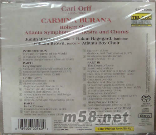奧爾夫 布蘭詩歌ROBERT SHAW SACD(m58.net) 羅伯.蕭 指揮 亞特蘭大交響樂團暨合唱團 聲響流讓經(jīng)典片更加發(fā)燒,美國發(fā)燒天書TAS選入超級唱片龍虎榜!本張Soundstream 錄製超級SACD隆重上巿。如資深音響玩家所周知,TELARC唱片公司在數(shù)位錄音發(fā)展的初期,就有多張CD被美國發(fā)燒天書TAS選入超級唱片龍虎榜,認為足以跟傳統(tǒng)LP唱片的音質(zhì)相比美。能夠音質(zhì)表現(xiàn)這麼優(yōu)秀,主要機密在於當(dāng)年TELARC係使用《聲響流(Soundstream)》錄音系統(tǒng)製作。這是一種根據(jù)50kHz採樣頻率的高階系統(tǒng),有別於標準CD唱片所根據(jù)的44.1kHz採樣頻率?!堵曧懥鳌返母邟駱宇l率提供了更加延伸的頻率響應(yīng)(可以高到25kHz),以及更多的細節(jié)。但是受限於CD唱片的規(guī)格,《聲響流》信號必需從50kHz轉(zhuǎn)化成44.1kHz,造成品質(zhì)的損失。如今在《直接數(shù)位流(Direct Stream Digital,簡稱DSD)》技術(shù)問世之后,由於其頻率響應(yīng)可以超過100kHz,因而能夠?qū)?0kHz採樣頻率的《聲響流》母帶重新處理為DSD模式,讓聆聽者聽到錄音當(dāng)時的真實音響。經(jīng)過長達十五年以上的等待!TELARC在全世界音響族的千呼萬喚之下,即將陸續(xù)推出這些傳奇經(jīng)典發(fā)燒盤的21世紀嶄新版。煥然一新的極品音質(zhì),加上足以傳世的爆棚名演,勢必再度掀起高品味音響愛好者的搶購熱潮!