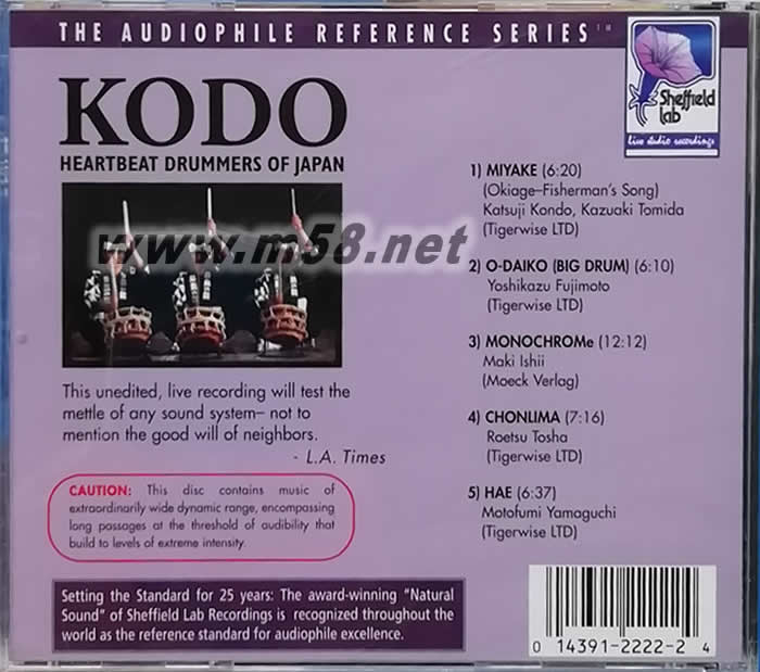 鼓道 KODO HEARTBEAT DRUMMERS OF JAPAN(m58.net) 初聽時覺得與想像中驚天動地的鬼太鼓完全兩樣,但靜下心來,這張鼓道有很多幾乎是留白的地方要你仔細聽那空間中空氣的流動,在極強與極弱間你才可以感受國際知名日本首席統敲擊組合傾力演出,爆炸程度,令喇叭花亦要在碟上印上警告字眼!