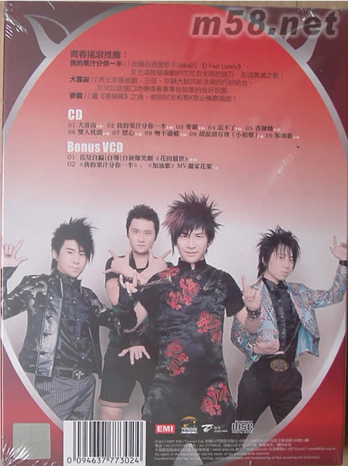CD 01. 大宇宙 02. 我的果汁分你一半 03. 麥霸 04. 忘不了 05. 香帥帥 06. 雙人枕頭 07. 留心 08. 吻不過癮 09. 胡說胡有理(小相聲) 10. 加油歌 Bonus VCD 01. 花兒自編自導自演爆笑劇《花田喜世》 02. 《我的果汁分你一半》、《加油歌》MV獨家花絮