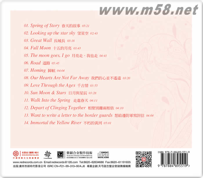 01. Spring of Story 春天的故事 05:21 02. Full Moon 十五的月亮 02:43 03. Looking up the star sky 望星空 03:18 04. The moon goes, I go 月亮走,我也走 03:43 05. Great Wall 長城長 04:41 06. Walk Into the Spring 走進春天 05:45 07. Love Through the Ages 千古情 04:04 08. Sun Moon & Stars 日月與星辰 03:20 09. Road 道路 03:55 10. Want to write a letter to the border guards 想給邊防軍寫封信 03:28 11. Depart of Clinging Together 相聚別離兩相依 04:11 12. Our Hearts Are Not Far Away 我們的心並不遙遠 04:10 13. Immortal the Yellow River 不朽的黃河 04:04 14. The Yellow River yellow黃河黃 05:01