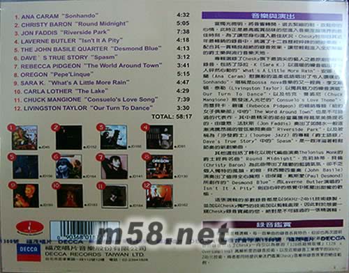 天籟之聲 新錄音精華大全 臺灣版(m58.net) 音樂與演出: 當(dāng)燭光微明,將音響轉(zhuǎn)開,退去緊繃的鞋,放鬆你的心情,此時(shí)正是最高鑑賞品味的您進(jìn)入音樂涅盤境界的最佳時(shí)刻。為了讓您身心進(jìn)入最佳狀況,Chesky特別自其近年最暢銷的錄音中,挑選了十二首歷經(jīng)焠鏈的絕妙樂曲,配合其一貫精良超絕的錄音效果,讓您輕鬆進(jìn)入全然無礙的爵士樂與流行音樂天地。 專輯選錄了Chesky旗下最頂尖的藝人之最原創(chuàng)的經(jīng)典錄音,包括了莎拉.K(Sara K.)以溫暖的嗓音唱出了令人砰然心動(dòng)的”What’s A Little More Rain”、安娜.卡蘭(Ana Caram)慰撫般的溫柔低語唱出了令人讚嘆的”Sonhando”,堪稱是bossa nova音樂的又一經(jīng)典、李文思頓.泰勒(Livingston Taylor)以獨(dú)具魅力的嗓音演唱”O(jiān)ur Turn To Dance”,以及恰克.曼裘尼(Chuck Mangione)散發(fā)迷人光芒的”Consuelo’s Love Theme”,而蕾貝卡.碧瑾(Rebecca Pidgeon)的暢銷專輯「紐約女子俱樂部」中的”The Word Around Town”也是不可錯(cuò)過的代表作。其中最精采的部份當(dāng)屬獲得葛萊美獎(jiǎng)提名的,由瓊恩.法狄斯(Jon Faddis)奏出了如開水一般逐漸沸騰昂揚(yáng)的管弦樂間奏曲”Riverside Park”,以及被稱為「沙發(fā)爵士」(lounge jazz)的專輯「爵士語錄」”Dave’s True Story”中的”Spasm”,是一首洋溢著輕鬆節(jié)奏的新創(chuàng)樂曲。 其他還包括了轉(zhuǎn)化以現(xiàn)代編曲演奏Thelonius Monk的爵士經(jīng)典名曲”Round Midnight”,克莉絲蒂.貝倫(Christy Baron)為此曲帶出了陰鬱的藍(lán)調(diào)氣氛,卻不乏個(gè)人獨(dú)特的風(fēng)韻。約翰.貝西爾四重奏(John Basile)演奏出了值得全心擁抱,由保羅.戴斯蒙(Paul Desmond)所創(chuàng)作的”Desmond Blue”。而Laverne Butler演唱的”Isn’t It A Pity”則自心碎的感覺中搖擺出甜蜜的歡愉。 收錄十二首Chesky近年最暢銷的錄音中歷經(jīng)焠鏈的絕妙樂曲,一貫精良超絕的錄音效果讓您輕鬆進(jìn)入全然無礙的爵士樂與流行音樂天地。以96kHz-24bit技術(shù)錄製,並加以Chesky獨(dú)門的技術(shù)加以剪輯處理,是對於想要一窺Chesky錄音寶藏的您,讓您輕鬆進(jìn)入全然無礙的爵士樂與流行音樂天地,絕對是不可錯(cuò)過的一張精選輯。 錄音監(jiān)賞: 專輯雖是精選輯,每一首樂曲的錄音各具特色,但卻也再次證明Chesky錄製的每一樂曲都足堪為錄音典范,俱為音響測試之最高標(biāo)準(zhǔn)。收錄的錄音包括了Chesky一向引以為傲的「128倍超頻取樣」(128 x Oversampling)高解析度的錄音技術(shù),以及近期錄音工業(yè)標(biāo)竿的96kHz-24bit技術(shù),兩者都同時(shí)提供樂迷們鑑賞Chesky音樂與錄音效果的絕佳范例。