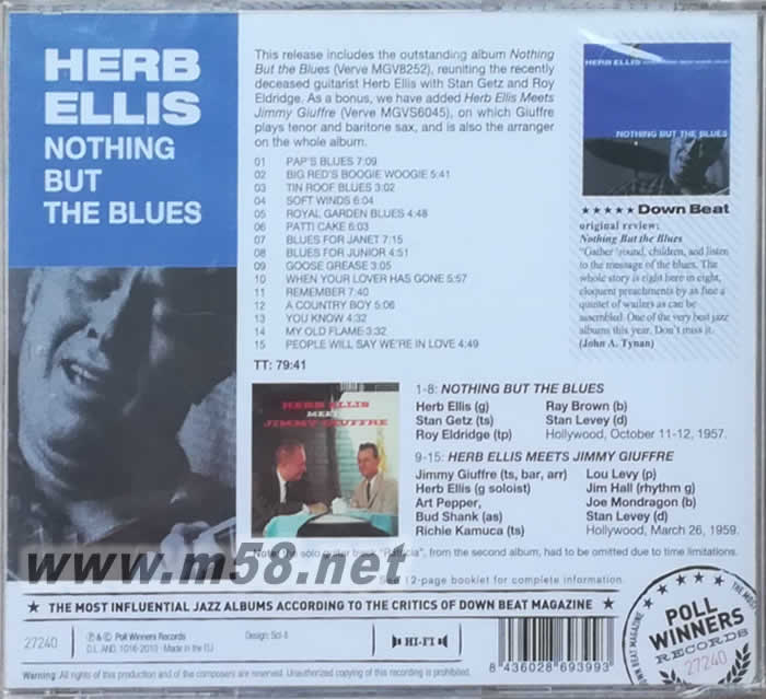 HERB ELLIS NOTHING BUT THE BLUES 藍(lán)調(diào)吉它(爵士大師五星系列)(m58.net) 爵士吉他手。最為人熟知的是他在鋼琴三重奏 奧斯卡彼得森三人組合的吉它手。 在埃利斯之后成為奧斯卡彼得森三人中的吉它手。從1953到1958隨著鋼琴家彼得森和貝斯手布朗三人一起演出。