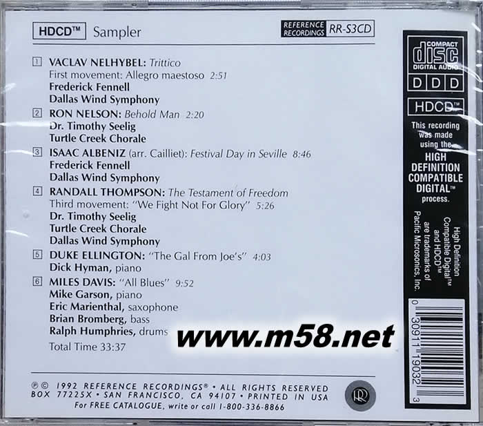 HDCD SAMPLER 示范天碟第一輯 HIGH DEFINTION COMPATIBLE DIGITAL(m58.net) 《RR HDCD示范天碟第一輯》是美國著名發燒錄音品牌RR在1992年發行的第一張HDCD效果示范碟,收入了以該技術制作的6段爆棚錄音。RR這家成立于1976年的唱片公司從誕生之日起就以高保真的聲音還原效果為訴求,并在CD唱片音質改良方面做出了很大的努力。 1992年他們推出的“HDCD數碼錄音技術”無疑是RR最杰出的成就之一。HDCD的全稱“High Definition Compatible Digital”直譯為“高清晰度CD”,它以傳統CD唱片為載體,提高了錄音回放的清晰度、層次感、空間感以及動態、定位等諸多方面,迅速被業界所認可。而在擁有HDCD解碼芯片的唱機上,這些提升則更為明顯!如今HDCD已經通過技術授權而被業界諸多唱片公司所廣泛采用。