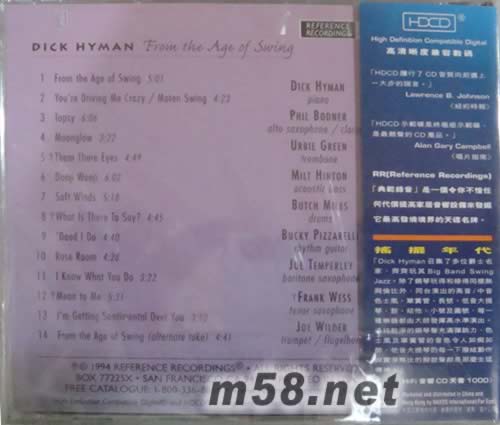 搖擺年代HDCD(m58.net) 1994年的《搖擺年代》,是一張標(biāo)準(zhǔn)的大樂團(tuán)(Big band)式演奏錄音。迪克?海曼運(yùn)用他在業(yè)界的號召力,集合了眾多高手,其中包括貝西伯爵的御用鼓手布奇?邁爾斯、藍(lán)調(diào)爵士吉他老將布基?皮扎瑞利(也就是當(dāng)代著名爵士吉他歌手約翰?皮扎瑞利的父親)、爵士長號大師烏爾比?格林、老牌薩克斯風(fēng)手弗朗克?魏斯等8位明星樂手。這些加盟的樂手雖然年齡、來歷迥異,但是他們擁有共同的一點(diǎn),那就是對搖擺爵士樂的熱愛。 《搖擺年代》專輯收錄的14首樂曲中,除首尾兩曲系由樂團(tuán)成員共同創(chuàng)作的新曲外,其余都是本尼?格魯?shù)侣⒈A_?懷特曼、貝西伯爵、艾靈頓公爵等人在二三十年代經(jīng)常演出的作品,包括《多吉伍吉》、《柔風(fēng)》、《你讓我瘋狂》、《我了解你所做的》等名作。 作為主奏者的迪克?海曼,自然擔(dān)當(dāng)起整個(gè)樂團(tuán)的靈魂人物,率領(lǐng)樂手們共赴這場搖擺盛宴。同臺(tái)演出的其他樂手,由于個(gè)個(gè)都是身懷絕技而且經(jīng)驗(yàn)豐富的高手,對舊式大樂團(tuán)搖擺樂有著充分的認(rèn)識,因此配合起來非常默契自如,在主奏者的引導(dǎo)下發(fā)揮出各自絕活,成就了一次高水準(zhǔn)的演出錄音。
