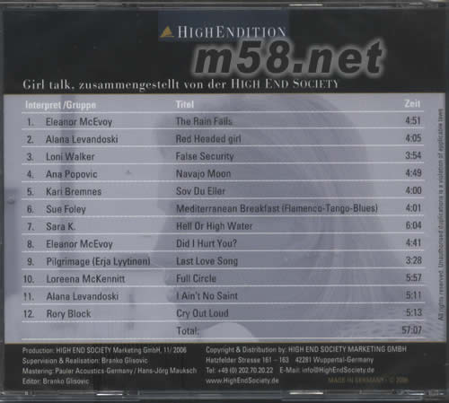 測(cè)試10 GIRL TALK VOLUME 10 GOLD DISC(m58.net) MADE IN GERMANY 個(gè)人佩服德國(guó)人對(duì)於音樂的認(rèn)知,這點(diǎn)我們不但可在Made in Germany的音響器材以及線材之中充份感受得到,從各音樂迷以及音響發(fā)燒友的碟藏之中,試揭揭看,當(dāng)中的大部份都是Made in Germany的 ! 由「德國(guó)高級(jí)音響協(xié)會(huì)」High End Society出品的錄音已不經(jīng)不覺間出至第10輯,而這第10輯的標(biāo)題為《Girl Talk》。顧名思義,《Girl Talk》是一張全女聲或由女將演奏樂器的發(fā)燒級(jí)錄音。 碟內(nèi)共收錄了12首歌曲,當(dāng)中有個(gè)別為純器樂作品,比方說第6軌選自Sue Foley的Mediterranean Breakfast,全部來自歐美著名歌手/樂手的經(jīng)典作品,如Eleanor McEvoy、Sara K,以及Alana Levandoski等等,High End Society在德國(guó)把母帶重新製模,令音效臻達(dá)更高境界! 當(dāng)?shù)?軌選自McEvoy的The Rain Falls的音樂響起不久,我已感受到聲音從容柔韌性一流,且深潛量感十足;低頻聲響不流於鬆郁膜。這張來自德國(guó)的精選再版錄音的音響效果顯然達(dá)至超凡脫俗境界!依我認(rèn)為,這段錄音在愈大的揚(yáng)聲器體系中播放,效果愈驚人。單論那份低頻從容不逼的張力感,已能叫人無法抗拒。而主唱Eleanor McEvoy的細(xì)膩優(yōu)美不可方物的磁性腔口,瞬間己把我的情緒牽動(dòng)看;她的聲線並不嬌美,但其情感的描繪力實(shí)在一流,其?人之處在於經(jīng)她演譯的歌曲似是行云流水般流動(dòng)。非冷血?jiǎng)游锏奈遥粍?dòng)情才怪。 顯而易見,這張經(jīng)由「德國(guó)高級(jí)音響協(xié)會(huì)」重新製模再版的《Girl Talk》,一切是以全頻平衡度為先,而全頻平衡度正確,音樂感以及音效性必然而生。這是一張正斗而絕不含刻意討好 (但偏頗)元素的發(fā)燒碟。