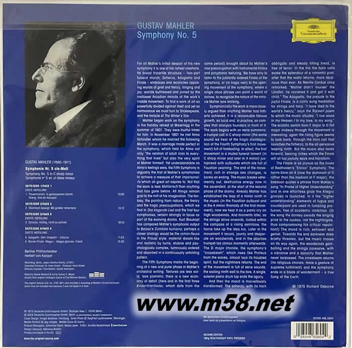 卡拉揚指揮 馬勒Mahler: Sinfonie Nr. 5 雙黑膠 藍膠(DG唱片125周年紀念版)專輯背面圖片