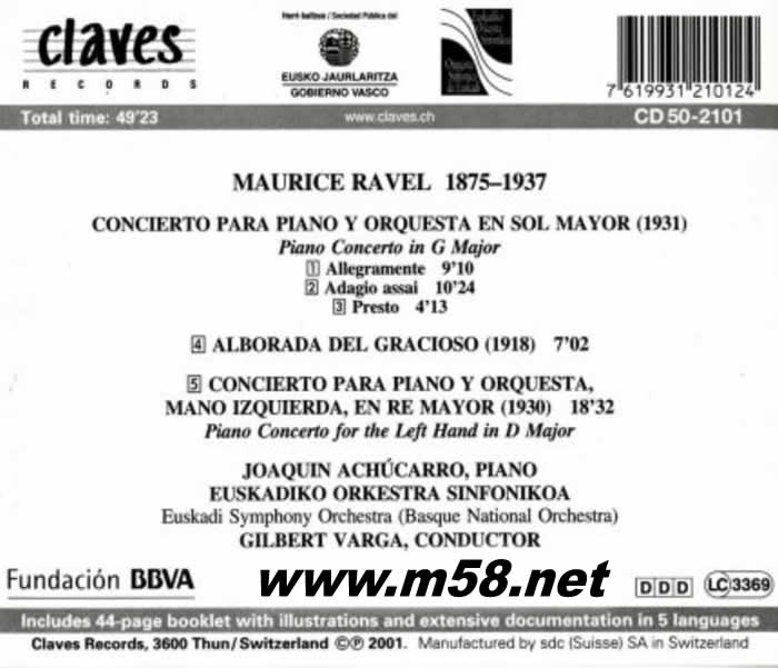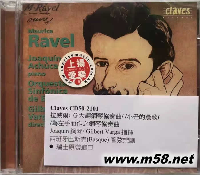 RAVEL: PIANO CONCERTOS & ALBORADA DEL GRACIOSO 拉威爾: G大調鋼琴協奏曲/ /小丑的晨歌/ /為左手而作之鋼琴協奏曲 Basque National Orchestra(m58.net) Joaquin鋼琴/ Gilbert Varga指揮 西班牙巴斯克(Basque) 管弦樂團 瑞士原裝進口 Ravel: Piano Concerto in G major Ravel: Alborada del gracioso (orchestral version) Ravel: Piano Concerto in D major (for the left hand)