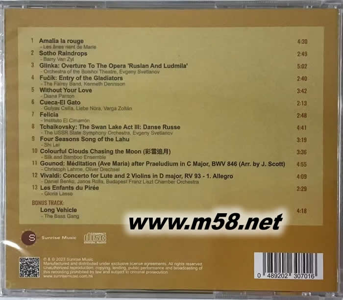 1 Amalia la rouge - Les ânes rient de Marie 4:30 2 Sotho Raindrops - Barry Van Zyl 2:49 3 Glinka: Overture To The Opera 'Ruslan And Ludmila' - Orchestra of the Boishoi Theatre, Evgeny Svetlanov 5:02 4 Fučík: Entry of the Gladiators - The Fairey Band, Kenneth Dennison 2:40 5 Without Your Love - Diana Panton 3:42 6 Cueca-El Gato - Gulyas Csilla, Liebe Nόra, Varga Zoltán 2:13 7 Felicia - Instituto El Cimarrón 2:48 8 Tchaikovsky: The Swan Lake Act III: Danse Russe - The USSR State Symphony Orchestra, Evgeny Svetlanov 4:41 9 Four Seasons Song of the Lahu - Shi Lei 3:19 10 Colourful Clouds Chasing the Moon (彩雲追月) - Silk And Bamboo Ensemble 3:36 11 Gounod: Méditation (Ave Maria) after Praeludium in C Major, BWV 846 (Arr. by J. Scott) - Christoph Lahme, Oliver Drechsel 4:55 12 Vivaldi: Concerto for Lute and 2 Violins in D major, RV 93 - 1. Allegro - Daniel Benko, Janos Rolla, Budapest Franz Liszt Chamber Orchestra 4:09 13 Les enfants du Piree - Gloria Lasso 2:29 Bonus Track: Long Vehicle - The Bass Gang 4:18
