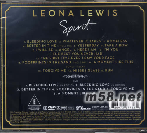 Spirit (THE DELUXE DEITION)(m58.net) 這位愛唱的的小妮子Leona Lewis,她的音樂傳奇故事已經在英國迅速蔓延,銳不可擋的往國際舞臺延燒。成為英倫歌唱選秀節目The X Factor第三季冠軍而展露頭角,翻唱Americn Idol美國偶像第一季冠軍Kelly Clarkson凱莉克萊森的成名曲”A Moment Like This”,以網路下載的形式搶先發行,立刻在30分鐘內被下載五萬次,入主最新金氏世界紀錄,打破有史以來銷售最快的單曲成績,第一個禮拜便開出 571,253張驚人紅盤,短短不到兩個禮拜,即穩穩佔據2006年全英整年度銷售第二名位置。 Leona的魅力席捲整個歐洲外,就連美國都看好這塊瑰寶,捧紅惠妮休斯頓、艾莉西亞凱斯等巨星的音樂界教父Clive Davis,以九百七十萬美金簽下Leona,準備為她全力開拓美國市場,就連師姐惠妮都直夸她將成為下一位舉世矚目的國際巨星!出生於英國倫敦,混有義大利、愛爾蘭血統的Leona,五歲時進入藝術院校大展與生俱來的音樂天份,12歲便開始創作歌曲。離開學校后,曾在比薩店當女服務生,為了賺錢租借錄音室錄製Demo帶。當音樂生涯四處碰壁,心灰意冷想要放棄之時,經男友的鼓勵參加The X Factor,終於讓這位黑珍珠閃亮發光,提早預約天后寶座的席位! 比賽結束后醞釀一年時間問世《Spirit》,英美兩大巨頭 Simon Cowell和Clive Davis執行製作,動員多位才氣音樂人齊力操盤,直接空降英國金榜冠軍,七個禮拜大破一百五十九萬張,成為英國史上銷售最快專輯第四名。第一波主打” Bleeding Love”,由美國創作偶像才子杰西麥卡尼,以及嘻哈界全方位製作金童Timbaland提攜的五人搖滾新貴OneRepublic主唱Ryan Tedder聯手撰寫,開賣第一天創下六萬六千張紀錄,霸佔英國金榜NO.1長達七週之久,成為英國單曲史上獲冠週數最長的女歌手;架構在節奏藍調與弦樂輔佐之”Whatever It Takes”,后段以福音式的合音呈現,加強遼闊澎湃激昂的氣流,Leona更參與此曲的創作;著重鋼琴演出的動聽小品”Better In Time”和”Yesterday”,真假音漂亮轉換且不耍過度花腔的演出,回歸瑪麗亞凱莉剛出道時的音質感動,”Here I Am”更散發”Hero”時期絕美的真摯情感;包覆濃厚美式節奏藍調旋律之”Angel”,吉他不慍不火的伴隨彈奏出如同碧昂絲冠軍金曲” Irreplaceable”相似音場;輕快中板的”The Best You Never Had”,是支滿溢性感滑順且浪漫悅耳的柔性曲目;”The First Time Ever I Saw Your Face”則是翻唱靈魂樂女伶Roberta Flack於1972年締造的冠軍單曲。Leona不斷在破英國音樂史紀錄,并入選美國權威影劇雜誌娛樂週刊/Entertainment Weekly「2008年值得你關注的八位人物」之列、「2007年度最佳演出」以及「下一位瑪麗亞凱莉」等好評,毫無疑問的,這個效應將在全球各地快速傳開!