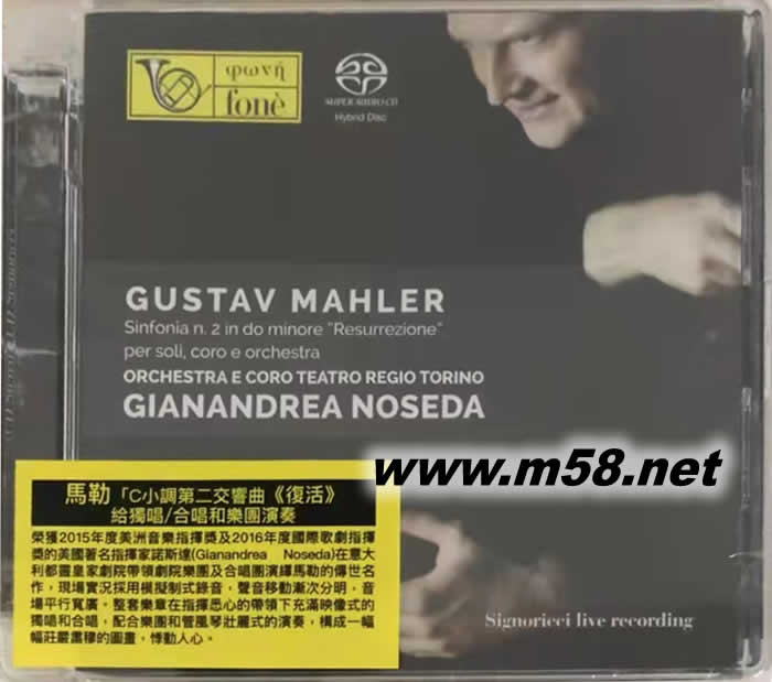 馬勒 C大調第2交響曲(復活)Mahler: Sinfonia n.2 in do minore SACD(m58.net) 1.榮獲2015年度美洲音樂指揮獎(Musical America's Conductor of the Year 2015)及2016年度國際歌劇指揮獎(International Opera Awards Conductor of the Year 2016)的美國著名指揮家詹尼安德烈·諾斯達(Gianandrea Noseda)曾帶領多個國際知名樂團包括倫敦交響樂團(London Symphony Orchestra),擅長演繹歌劇及聲樂作品,而馬勒是他最心儀的作曲家之一。 2. 諾斯達於2015年在意大利都靈皇家劇院(Teatro RegioTorino)帶領劇院樂團及合唱團演繹馬勒的傳世名作[C小調第二交響曲"復活"],現場實況錄音由著名錄音師里玆 (Giulio Cesare Ricci)執行,聲音移動漸次分明,音場平行寬廣,音效立體清晰。 3. 整套樂章在指揮悉心的帶領下充滿映像式的獨唱和合唱,配合樂團和管風琴壯麗式的演奏,構成一幅幅莊嚴肅穆的圖畫,悸動人心。 4. 專輯以SACD為載體,聲效更為顯著,帶來更完美更真實的發燒古典示范盤。。