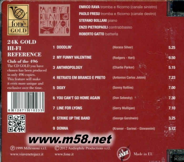 恩里科.拉瓦(Enrico Rava)是意大利傳奇的小號演奏家,他在國際爵士樂壇的地位跟切特.貝克(Chet Baker)不相伯仲,其吹奏小號的魔力顛倒一眾樂迷。天才橫溢的小號/夫呂號(flugelhorn)演奏家保羅.弗蘇(Paolo Fresu)從11歲時便在卡利亞里音樂學院(Conservatory of Cagliari)受到音樂大師莫蘭迪尼(Enzo Morandini)的指導,除了演奏出色外,他亦是著名的編曲和作曲家,是爵士樂的殿堂級人物。拉瓦和弗蘇對切特.貝克推崇備致,他倆於1998年貝克 逝世10週年時舉辦多場音樂會以對貝克的衷心致敬。隨后的一年,他們聯同以演奏古典樂和爵士樂的米蘭著名鋼琴家斯特瓦諾.伯拉尼 (StefanoBollani),曾獲得意大利最具權威的“音樂雜誌“(Musica Magazine)頒發之【最佳意大利爵士樂隊(Best Italian Group)】的低音大提琴手恩佐.彼特奧保尼(Enzo Pietropaoli)和出生於羅馬之著名爵士樂鼓手羅伯托.加托(Roberto Gatto)繼續他們對貝克致敬之音樂之旅,演奏所有貝克的著名作品及其喜愛之歌曲,無論演奏風格、情調和樂風跟貝克在其黃金的五十年代時相若,此專輯精 選所有貝克生前最鐘愛的樂曲,加上五位技術高超的爵士樂大師的真情演繹,配合錄音大師里玆(Giulio Cesare Ricci)以最精巧的器材及其高超的錄音技術錄製這些不朽名曲,其精彩處非筆墨所能形容。全球限量496張的24K金CD為載體, 珍貴收藏必備之選。