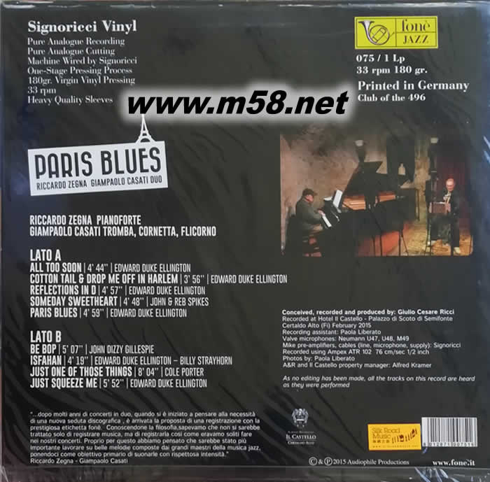 ![里卡爾多.杰尼亞及詹保羅.奧.卡薩蒂 巴黎之怨曲Riccardo Zegna & Giampaolo O Casati [Paris Blues] 爵士二重奏 鋼琴與小號 黑膠專輯背面圖片](http://m.m1ntcellars.com/upimages/product_pic/2021-5/2021530104734.jpg)