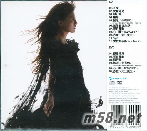 CD 01. 天女 02. 愛看得見 03. 飛行志 04. 細(xì)節(jié) 05. 加油!你有ME! 06. 三生世 三生路 07. 明日贊歌 08. 心.戰(zhàn)~RED CLIFF~ 09. 赤壁~大江東去~ 10. Sign 11. 愛就是手 (Bonus Track) DVD 01. 愛看得見 02. 明日贊歌 03. 飛行志 04. 加油!你有ME! 05. 心.戰(zhàn)~RED CLIFF~ 06. 赤壁~大江東去~