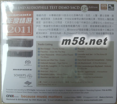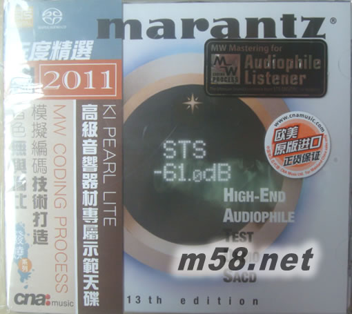 MARANTZ鑒聽王 年度精選2011 天碟第13張SACD終極示范(m58.net) MarantzR 2011年度精選】 KI PEARL LITE音響器材專屬示范天碟 模擬編碼技術打造 音色無與倫比 【MarantzR 年度精選】至今已出版到第13張,這年度精選是發(fā)燒友每年必須擁有和收藏專輯,因STS與其硬件贊助商對此十分重視,STS每年之錄音技術固然有長進,硬件贊助商也一樣新品盡出,音效保証最高。本專輯收錄16首多元化音樂,內(nèi)容包括:人聲、爵士音樂、敲擊、樂器演奏、古典音樂,中世紀音樂等必備的試機元素;特別在人聲的真確度、錄音場地之空間感,各種不同樂器的立體聲和定位方面都作出強化,無論是在訊噪比或是動態(tài)范圍內(nèi)每一分貝,都能精確地顯現(xiàn)出來。「MarantzR年度精選2011」是MarantzR 高級音響公司指定的第十三輯之示范測試軟件,特別為全新一系之MarantzR KI PEARL “LITE” 高級音響器材度身打造之專屬SACD示范天碟。 人聲: tracks 1, 2, 3, 4, 6, 8, 11 & 13 樂器: tracks 5, 7, 9, 10, 12, 14, 15 & 16