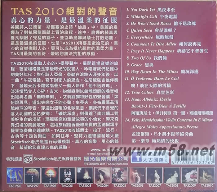 TAS 絕對的聲音CD 2010 鬼斧神功(m58.net) TAS 2010 絕對的聲音 挑戰(zhàn)最挑剔的耳朵 真心的力量‧是最溫柔的征腹 收錄古典、拉丁、爵士、流行等十四首樂曲 德國老虎魚 原版母帶製作 英國詩人艾德蒙?斯賓塞的史詩《仙后》中,美麗的烏娜為了對抗惡龍而踏上冒險旅程;途中,烏娜的純真與善良馴服了兇猛的獅子,并協(xié)助烏娜與騎士打敗惡龍。這是最溫柔的征服,也是《絕對的聲音2010》所要呈獻(xiàn)給您的,真心的音樂撫慰人心,更可以成為抵抗亂世的溫柔力量,用最美的音符,帶給您無法抗拒的感動。《絕對的聲音2010》在撼動人心的小提琴聲中,展開這場音樂的旅程,芭菠楊格像是穿梭時光的說書人,吟唱著我們記憶中的美好年代;旅行詩人亞倫?泰勒在浪跡天涯多年后,以一曲“午夜電話”寫下對家人的思念;在尼龍弦吉他伴奏下,發(fā)燒天后卡羅爾·基德唱著又一動人新作“他不送玫瑰”,淡淡情愁令人心碎;吉米?約杰森則以銷魂頹廢的嗓音唱出經(jīng)典名曲“無時無刻”;艾莉絲獨特野性的聲音讓“如何說再見”道出失戀女子的心聲;史蒂夫?多布羅葛茲清脆如珠的琴音,穿透出溫暖的北歐氣息,讓我們不自覺的落入北國的金色夢鄉(xiāng);“礦坑深處”則傳達(dá)了南非礦工對美好生命的渴望;瑪麗姿宛如童話故事的小仙女,帶來奇異幻境的美麗歌聲。這段旅程隨著優(yōu)雅高貴的門德爾松小提琴協(xié)奏曲到達(dá)終點。 《絕對的聲音2010》收錄爵士、拉丁、流行、古典等十四首樂曲,如同往年,堅持力邀德國發(fā)燒大廠老虎魚進(jìn)行母帶后製。真心的音樂,用心的錄音,希望給您直達(dá)心底的感動。