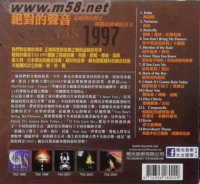 TAS 絕對的聲音CD 1997(m58.net) 我們對音樂的刻求 正如同您對音樂之極品味的苛求 絕對的聲音TAS 1997網羅了跨越美國、英國、德國、挪威、瑞典、意大利、日本頂尖的錄音技術,最好的音樂、唯有搭配最好的錄音技術才能襯托出的它的極·致·美·聲 一如們對音樂的執著,今年,極光音樂依舊秉持著對音樂一貫的苛求,推出了發燒大碟1997來滿足發燒迷們的渴望。我們從LINN、SHEFFIELD LAB、VENUS……等擁有寶士級錄音技術的世界知名廠牌中,嚴選了14首發燒友必聽之樂曲,一次擄獲您全部的心。 在這張大碟中,書錄了來自挪威數百年來的最佳歌謠[I HERE YOU]、以及挪威的現代流行音樂[夜曲、,不同的吟唱風格,詮釋出音樂潮流隨著時代的差異性,帶領著您穿梭時空的走廊。若提到爵士樂,卡蘿姬是永遠不能被忽略的名字,真摯的情感、最感動人心的嗓音,仔細聆聽[YOU DON‘T BRING ME FLOWERS]將會發現數十年來的歌后風采絲毫不減。另外包括[I THINK IT’S CNA RAIN TODY]、[IF YOU LOVE ME都是不容錯過的曲子,不同的演唱方式,讓抒情女聲擁有了不同容貌的呈現。 一張融合了爵士、古典、流行、民謠、NEW AGE、世界音樂、發燒人聲等音樂類型,網羅世界一流的錄音公司,加上頂尖的藝人與不凡的音樂,就是[絕對的聲音1997]擁有百萬頂極身價的最好證明]!