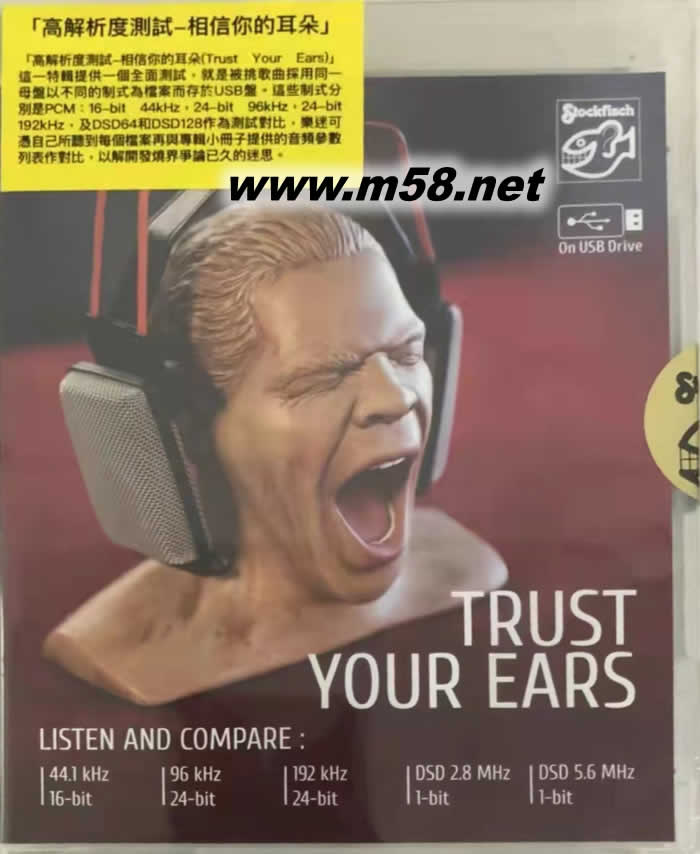 高解析度測試 TRUST YOUR EARS 相信你的耳朵 U盤 老虎魚(m58.net) 1. 熱烈追求高音效的樂迷通常會尋求和爭論原版和再版的音質(zhì)那個會比較優(yōu)勝,或是同一版本因採用不同的PCM訊號和復(fù)製於不同的載體,音色和效果也有不同程度的差別,但這些出版通常不是採用同一音源母盤和會作修改、調(diào)教和補足,因此那個版本的音質(zhì)較為優(yōu)勝是難以作出統(tǒng)一的定論。
