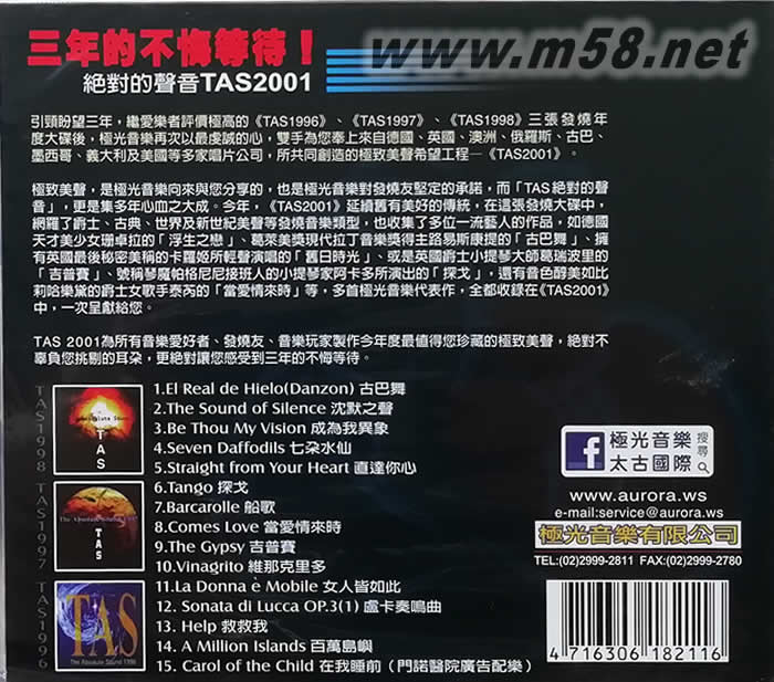 TAS 絕對(duì)的聲音CD 2001(m58.net) 請(qǐng)點(diǎn)看產(chǎn)品正、背面大圖 引頸盼望三年,繼愛樂者評(píng)價(jià)極高的《TAS1996》、《TAS1997》、《TAS1998》三張發(fā)燒年度大碟后,極光音樂再次以最虔誠(chéng)的心,雙手為您奉上來自德國(guó)、英國(guó)、澳洲、俄羅斯、古巴、墨西哥、意大利及美國(guó)等多家唱片公司,所共同創(chuàng)造的極致美聲希望工程--《TAS2001》。 極致美聲,是極光音樂向來與您分享的,也是極光音樂對(duì)發(fā)燒友堅(jiān)定的承諾,而[TAS絕對(duì)的聲音],更是集多年心血之大成。今年,《TAS2001》延續(xù)舊有美好的傳統(tǒng),在這張發(fā)燒大碟中,網(wǎng)羅了爵士、古典、世界及新世紀(jì)美聲等發(fā)燒音樂類型,也收集了多位一流藝人的作品,如德國(guó)天才美少女珊卓拉的[浮生之戀]、葛萊美獎(jiǎng)現(xiàn)代拉丁音樂獎(jiǎng)得主路易斯康提的[古巴舞]、擁有英國(guó)最后秘密美稱的卡蘿姬所輕聲演唱的[舊日時(shí)光]、或是英國(guó)爵士小提琴大師葛瑞波里的[吉普賽]、號(hào)稱琴魔帕格尼尼接班人的小提琴家阿卡多所演出的[探戈],還有音色醇美如比莉哈樂黛的爵士女歌手泰芮的[當(dāng)愛情來時(shí)]等,多首極光音樂代表作,全都收錄在《TAS2001》中,一次呈獻(xiàn)給您。 TAS2001為所有音樂愛好者、發(fā)燒友、音樂玩家制作今年度最值得您珍藏的極致美聲,絕對(duì)不辜負(fù)您挑剔的耳朵,更絕對(duì)讓您感受到三年的不悔等待。