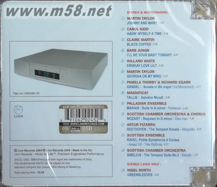 STEREO MULTICHANNEL: 1、MARTIN TAYLOR/JOHNNY AND MARY 2、CAROL KIDD/HAVIN MY SELF A TIME 3、BARB JUNGR/I‘LL BE YOUR BABY TONIGHT 5、WILLARD WHITE/ERISKAY LOVE LILT 6、MARTIN TAYLOR/GEORGIA ON MY MIND 7、PAMELA THORBY RICHARD EGARR/HANEEL 8、MAGNIFICAT 9、PALLADIAN ENSEMBLE 10、SCOTTIXH CHAMBER ORCHESTRA CHORUS 11、ARTUR PIZARRO 12、SCOTTISH ENSEM BLE 13、SCOTTISH CHAMBER ORCHESTRA STEREO LAYER ONLY: 14、NIGEL NORTH /GREENSLEEVES