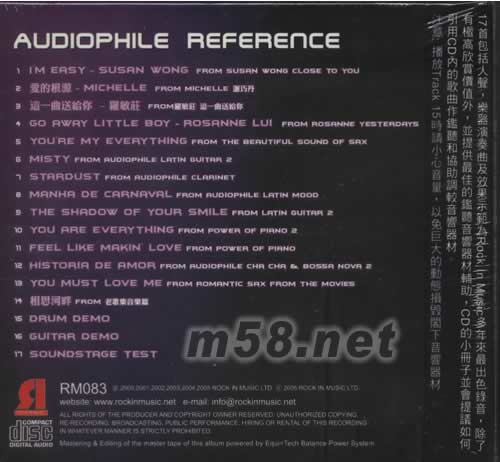 1.IM EASY-SUSAN WONG FROM SUSAN WONG CLOSE TO YOU 2.愛的根源-MICHELLE FROM MICHELLE 謝巧丹 3.這一曲送給你-羅敏莊 FROM 羅敏莊 這一曲送給你 4.GO AWAY LITLE BOY-ROSANNE LUI FROM ROSANNE YESTERDAYS 5.YOUR MY EVERY THING FROM THE BEAUTIFUL SOUND OF SAX 6.MISTY FROM AUDIOPHILE LATIN GUITAR2 7.STARDUST FROM RUDIOPHILE CLARINET 8.MANHA DE CARNAVAL FROM AUDIOPHILE LATIN MOOD 9.THE SHADOW OF YOUR SMILE FROM LATIN GUITAR2 10.YOU ARE EVERYTHIG FROM POWER OF PIANO2 11.FEEL LIKE MAKIN LOVE FROM POWER OF PIANO 12.HISTORIA DE AMOR FROM AUDIOPHILE CHA CHA&BOSSA NOVR2 13.YOU MUST LOVE ME FROM ROMANTIC SAX FROM THE MOVIES 14.相思河畔 FROM 老歌集音樂篇 15.DRUM DEMO 16.GUITAR DEMO 17.SOUNDSTAGE TEST