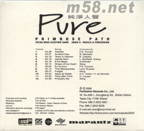 PRIMROSE PATH 純凈人聲PURE XRCD(m58.net) 細碎聲尾弱音亦夠齊全,定位更是Sharp到出奇音響技術 發燒CD - 主筆: 波仔這隊來自風車國荷蘭的Pure一男一女二人組合,成員分別為電子豎琴演奏家Petra Rosa和黑人敲擊樂手Eddie C.,這兩位天才橫溢,縱橫多個不同派別音樂的資深玩家,在歐洲多個國家早已紅透半邊天,今趟非常難得地走在一起,以清新感性 unplugged 手法重新翻唱十二首經典流行曲作品如 Eric Clapton"Tears ln Heaven"、Stevie Wonder"If lt's Magic"、Sting "Shape Of My Heart"及Cindy Lauper"Time After Time"等等。有關製作環節,本碟所有歌曲均在荷蘭一所名為STS Studio 灌錄,由Maxanter負責出品及發行,或許大家對於這家唱片公司認識不多,但他們所用的錄音器材卻是不折不扣的發燒級品種,唱片小冊子內所指,由拾音器開始以至A/D轉換器、鑑聽系統跟全套 線材,皆為發燒友熟悉的Weiss、Siltech、Marantz及WBT等,可謂 名牌盡出,必然是信心保証。 歌曲方面,[Primrose Path]內全數作品皆由聲線低沉且略帶沙啞Eddie C.主打,加上Petra節奏優雅的豎琴伴奏,初次聆聽時感覺較為另 類,皆因Eddie的唱腔略帶美式騷靈音樂影子,但當聽了三幾首之 后便會適應,並且越聽越引人入勝,就以第八首"This Masquerade" 為例,Eddie的表達方式顯然沒有George Benson那樣肉緊造作,但 聽起來卻沒有丁點平板單調之嫌,歌詞內所散發的落幕失意氣息仍 能一一道破,有關錄音質素,聽畢全碟后發覺人聲跟樂器質感均非 常充實,細碎聲尾弱音亦夠齊全,定位更是Sharp到出奇,喜好另 類發燒軟件人仕懇請萬勿錯過!音響技術 主筆:Manfred樂評人和樂迷聽歌的最大分別,就是前者由批評出發,后者以欣賞為先。再不同者就是樂評人要事事有準備,有資料才放上唱片,但樂迷可以為聽到一首歌曲而愛上一個名字,不問底細。作為樂迷這是幸福,但如知更多會更入昧,這是千真萬確。偶然機會我也隨手拈起一張毫不吸引的CD,像這封面啡色的一男一女,以為是Tuck & Patti: 這是一個名Primrose Path的組合,女的Petra Rosa是荷蘭著名的豎琴演奏家,而男的是歌手兼敲擊手Eddie C,構成的Primrose Path,玩了人家作品;此碟由一間荷蘭小小公司出品,名為 Maxanter,CD上有其 website,但進入后全是荷蘭文,可見很地道;但這一張大碟竟然玩了很多人家歌曲,如Clapton的Tears ln Heaven,此曲一直不得我心,曲是好但Clapton的苦味很叫我不安;但這次PP演繹出一份很舒服,如天堂中的平和安靜,少有的好cover,值得推薦。Rosa的harp很流水感覺,清悅動人。而Eddie C的唱,雖黑人但很standard風格,唱了三首 Sting作品Shape Of My Heart、 Probably Me和Fragile,竟然恰好,不似Cafe music,不似過甜的standard唱法,也不覺 Sting的Jazz風格,反而帶點清新的路向,很好聽。一曲 Eute Amo同樣出色悅耳。我喜愛的Cyndi Lauper名曲Time After Time落在Primrose Path手上,則不及Cyndi那味道,但 harp加vocals也和諧動聽極。