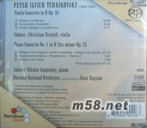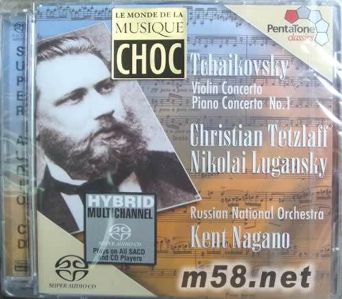 柴科夫斯基D大調小提琴協奏曲和降B小調第一號鋼琴協奏曲SACD(m58.net) Christian Tetzlaff, 小提琴 Nikolai Lugansky, 鋼琴 這是柴科夫斯基的兩首最著名的協奏曲,它們結構宏大,華美壯麗!需要有高超的演技水準和最為到位的錄音才能展現它的完美。幾乎所有的樂迷都曾被這兩首樂曲所傾倒,它們代表著柴科夫斯基協奏曲的最高成就!也是古典音樂中俄羅斯樂派經久不衰的名作!魯甘斯基鋼琴;特茲拉夫小提琴;納格農指揮俄羅斯國家交響樂團演奏!SACD還原最高品質音效!
