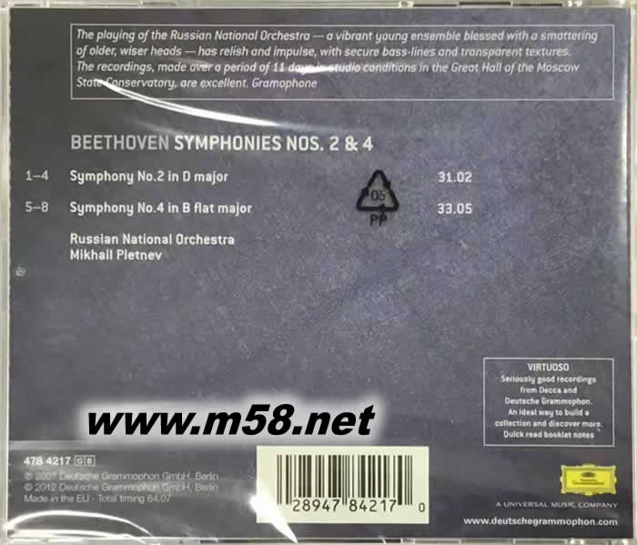 Beethoven : Symphonies Nos.2 & 4 貝多芬:第二、四號交響曲(m58.net) 一百多年來,人們對貝多芬九首交響曲的喜愛不因時間的更迭而有所改變,它們也成為往后交響曲發(fā)展最重要的基石。創(chuàng)作第二號交響曲時,貝多芬已有失去聽力的預(yù)感,因此它幾乎是在與命運的搏斗中完成這部作品。第四號交響曲創(chuàng)作於1806年,是一部充滿了明朗詩意與微妙層次的作品,與第三號交響曲的風(fēng)格恰成對比,白遼士曾經(jīng)稱讚它的第三樂章是「如天使般的純潔,具有無法抗拒的溫柔」。 普雷特涅夫是唱片史上第一位指揮俄羅斯樂團(tuán)錄製貝多芬九首交響曲的俄羅斯指揮家,他的詮釋把握著貝多芬「音樂的任務(wù)就是把火花從一顆心傳達(dá)到另一顆心」的藝術(shù)理念,在他的指揮棒下,貝多芬耳熟能詳?shù)慕豁懬拖褚蛔腥さ膶殠臁F绽滋啬蚩偸悄芪⒚畹啬媚笞穲F(tuán)聲部的平衡與動態(tài),在輕盈中塑造漂亮而豐富的層次、節(jié)奏感與細(xì)節(jié),並且不斷從樂譜中找到令人驚訝不已的全新邏輯,讓所有愛樂者重新思考自己對於貝多芬交響曲的了解。 【曲目】貝多芬:D大調(diào)第二號交響曲,作品36 [1]第一樂章:很慢的慢板─有活力的快板 [2]第二樂章:小緩板 [3]第三樂章:詼諧曲,快板 [4]第四樂章:很快的快板 貝多芬:降B大調(diào)第四號交響曲,作品60 [5]第一樂章:慢板─活潑的快板 [6]第二樂章:慢板 [7]第三樂章:活潑的快板 [8]第四樂章:快板,但不太快